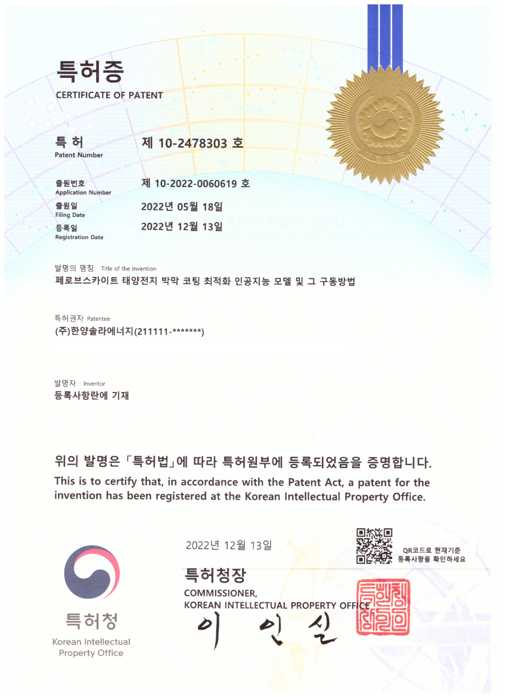 - 당사는 이를 바탕으로 대면적 페로브스카이트 태양전지 제작에 용이한 Slot-die coating 기술을 이용해 지능화된 대면적 코팅 장비를 개발하였습니다.